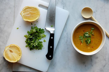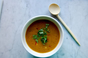 6. Ladle the soup into bowls and garnish with the cilantro and, if available, a few crushed saffron threads. Serve with the lemon wedges and good bread.