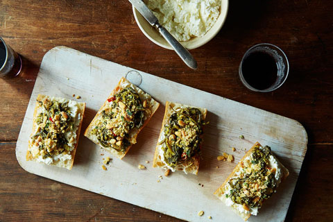 Remove the pot from the heat and season with salt and pepper. Serve the rabe topped with the pine nut crumble (see below) and topped with dollops of ricotta cheese. Or, spread ricotta on baguette, then top it with broccoli rabe and crumble Grand Cru Cellar.
