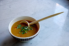 6. Ladle the soup into bowls and garnish with the cilantro and, if available, a few crushed saffron threads. Serve with the lemon wedges and good bread.