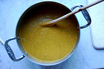 4. Puree the soup. If you don't have an immersion blender, don't forget to let the soup cool before blending. The soup should be brothy and not too thick (it's soup, not potage or puree). Adjust the thickness of the soup with any reserved broth or water.