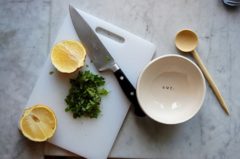 3. Meanwhile, chop your bouquet of cilantro and the parsley. Set aside several pinches of cilantro to use as garnish. Juice two of the lemons. Chop the 3rd lemon into wedges and set aside to serve with the soup.