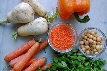 1. Heat some olive oil in a soup pot. Add the onion and cook, stirring occasionally, until soft, translucent, and starting to caramelize in places. Add in the garlic and ginger and let cook a few minutes, until fragrant. Add in the tomato paste and let toast for a minute. Stir in the lentils, carrots, and turnips and stir everything around the coat. Add in 1 teaspoon of salt, the cumin, paprika, ras al hanout, a few cracks of black pepper, and a few threads of saffron, crumbled. Stir everything around to coat and let cook a few minutes, until the spice are fragrant.